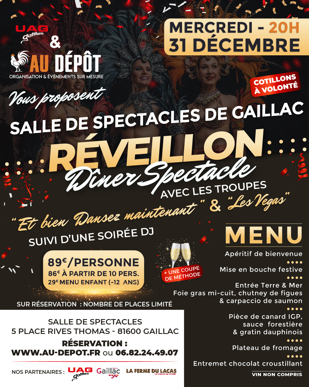 Venez fêter le réveillon de la St Sylvestre, au Dépôt dans une ambiance cabaret et au menu de fête.